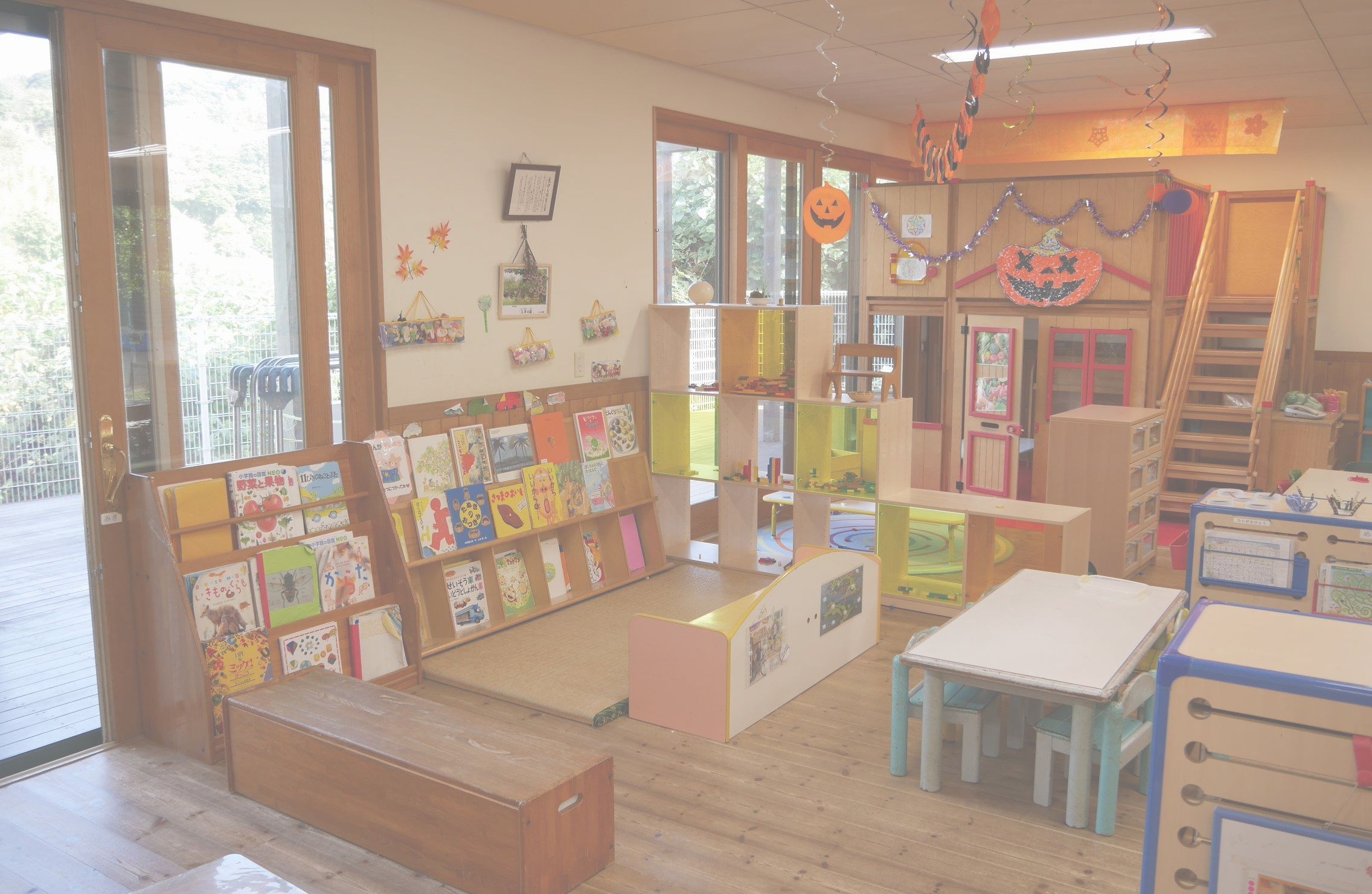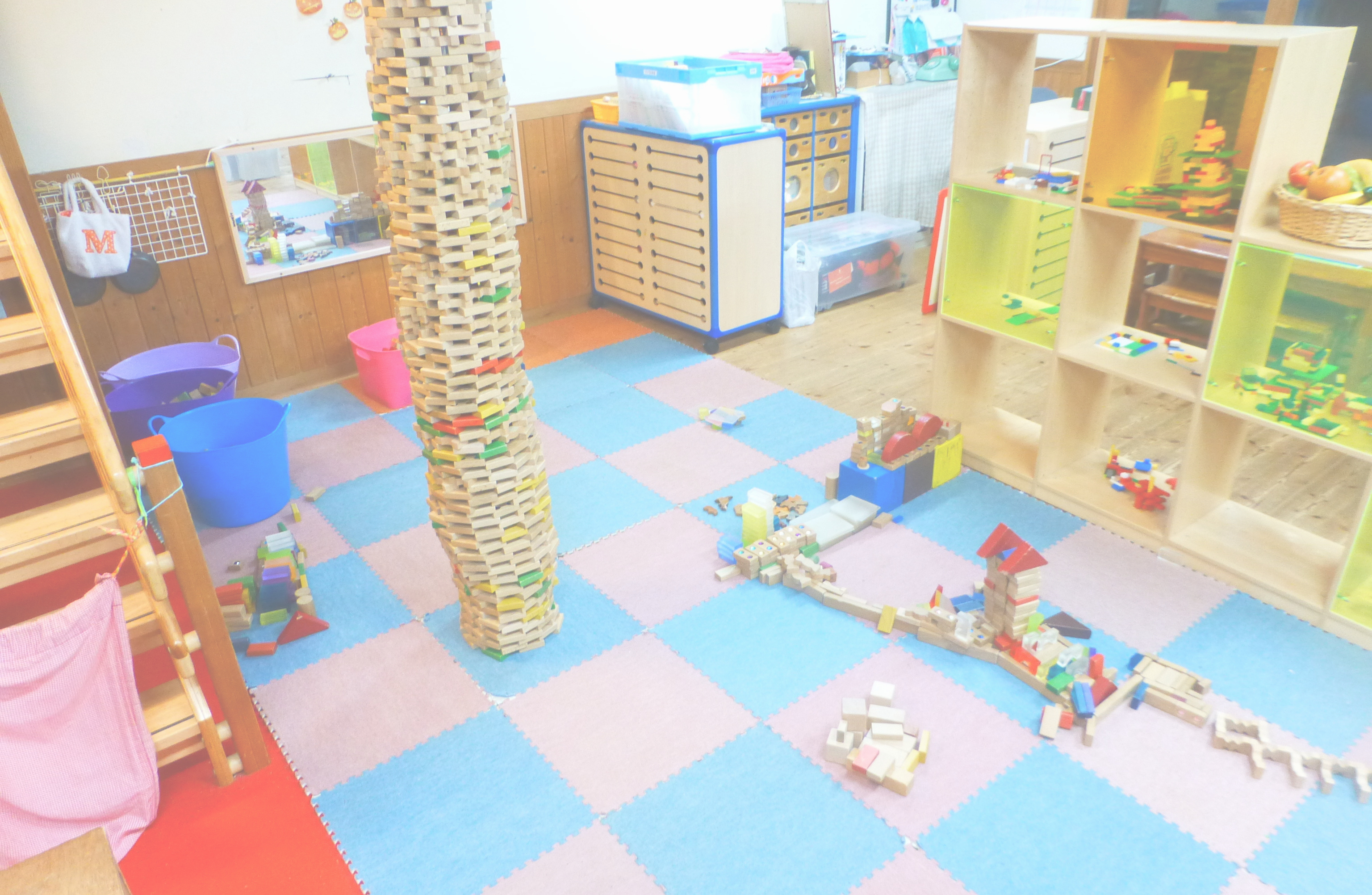 保育室は遊びのミュージアム。子どもの主体的・自発的活動の保障のために設けています。子どもが自分の好きな活動、物、人を自分で選べるようになっています。絵本ゾーン、製作ゾーン、科学ゾーン等の常設ゾーンだけでなく、季節や時期、子どもの活動に合わせて開設される期間限定のゾーンもあります。