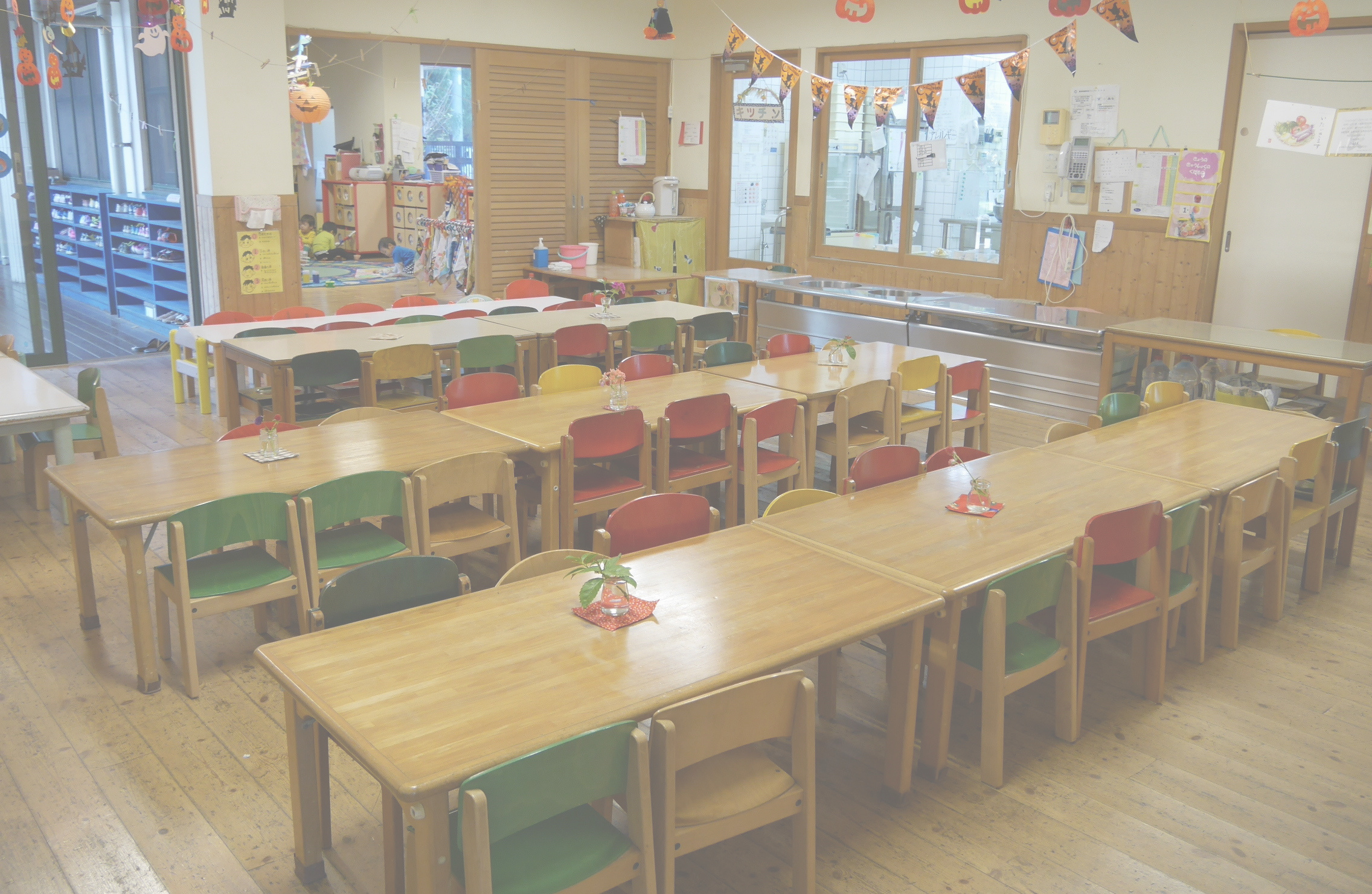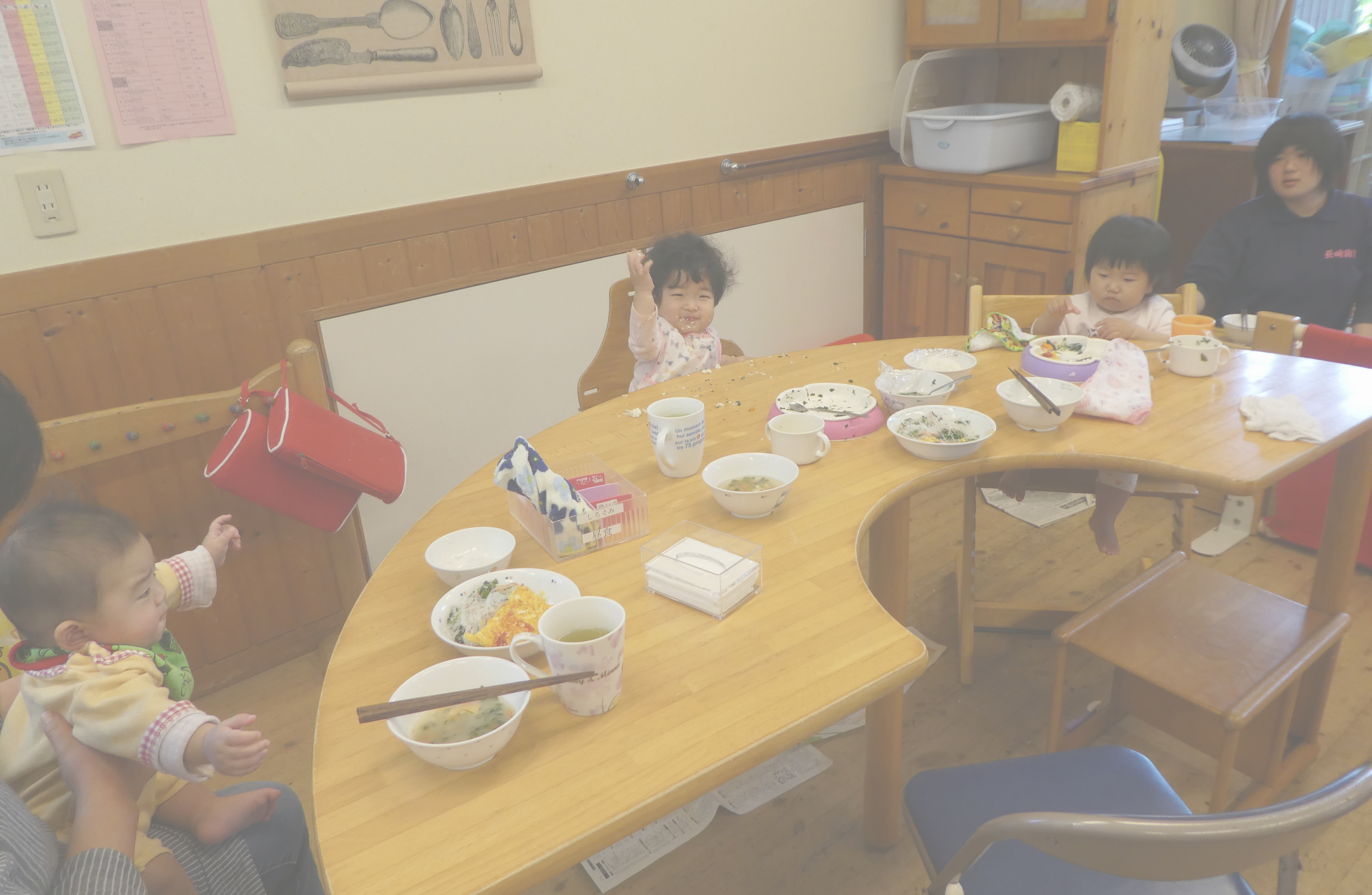 ランチルーム 食事前後の活動とは重ならないスペースを確保します。調理室の中の様子が見られるように、食事を作る音やにおいが保育室に届くように配置しています。また、米研ぎ・野菜切りなどのお手伝い、梅干し作り、ジャムつくりなどの食育活動にも利用します。