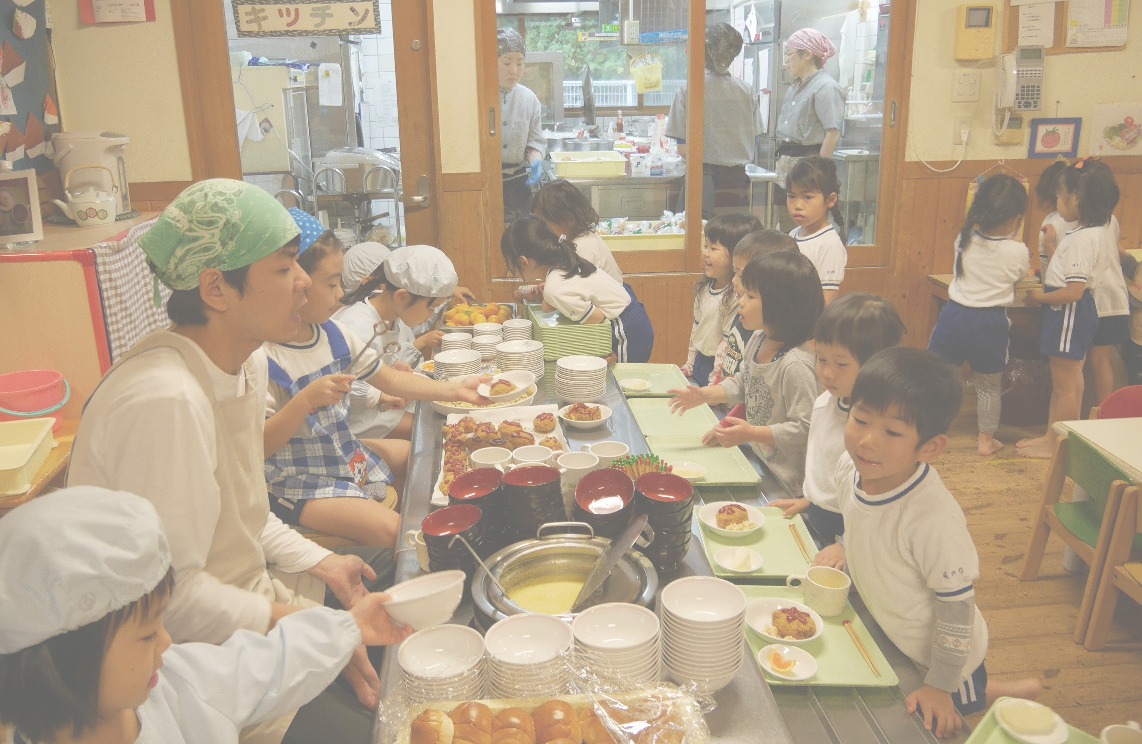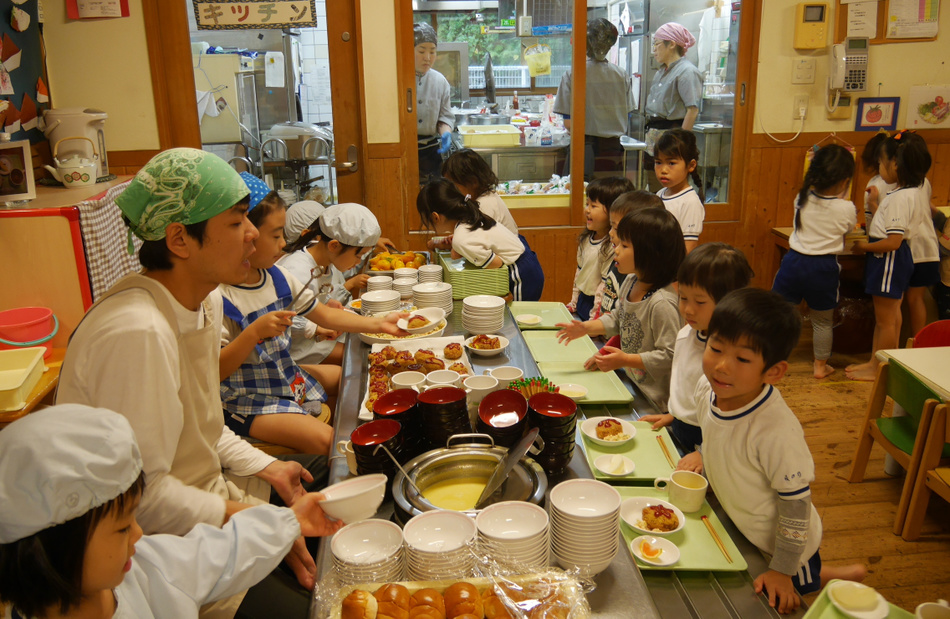セミバイキング 当番の人に自分の食べたい量を伝え、よそってもらうスタイルです。子どもたちが人と関わる場面をあえて設定しています。会話を通して子どもたちは、自分の言葉で自分の考えを伝えることを学び、相手の考えを理解しようとする力を育んでいきます。そして自分はどのくらい食べることができるだろうかという見通しも学びます。